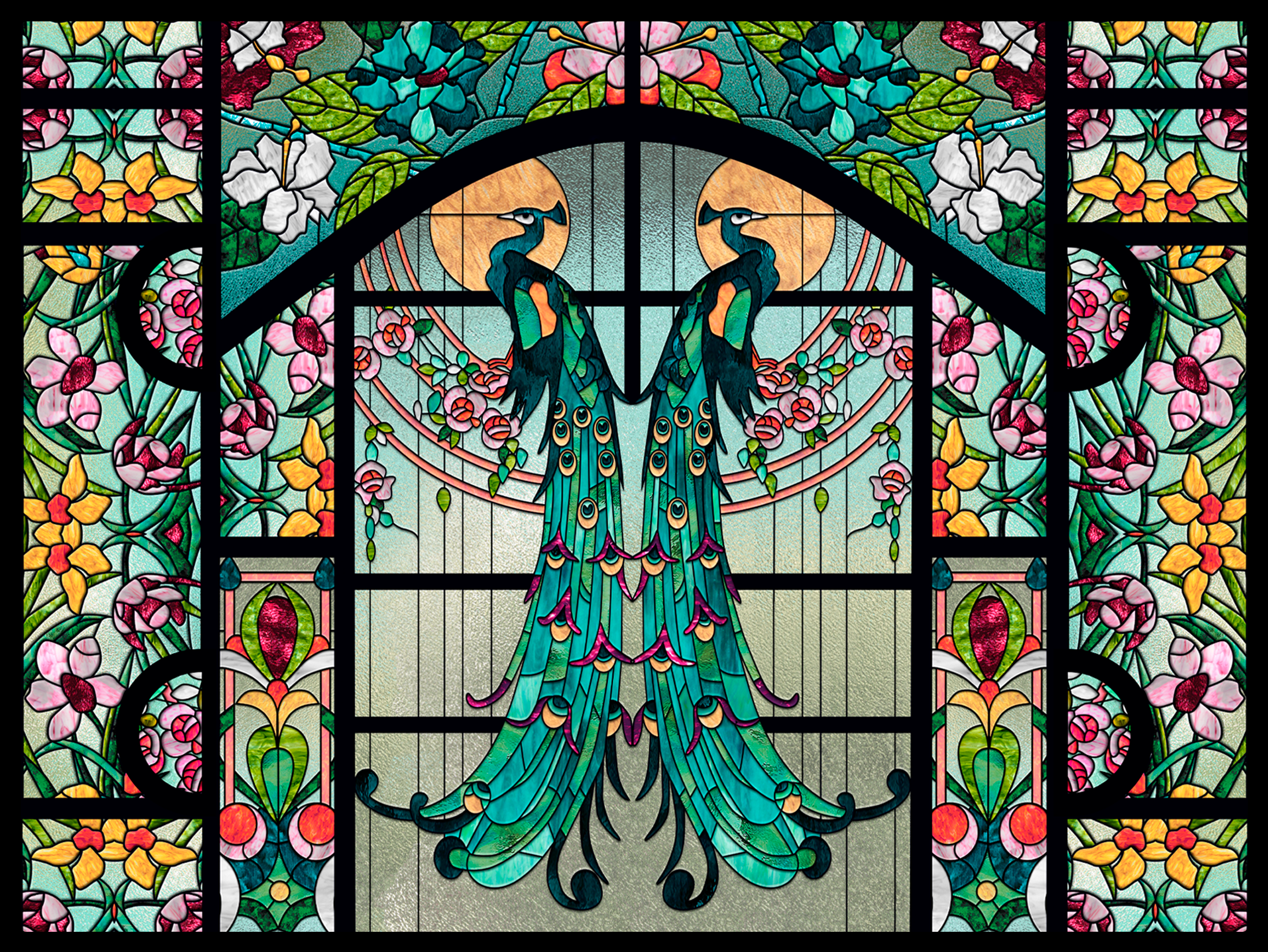 A blend of illustration and Photoshop rendering is employed to craft intricate stained glass window designs.