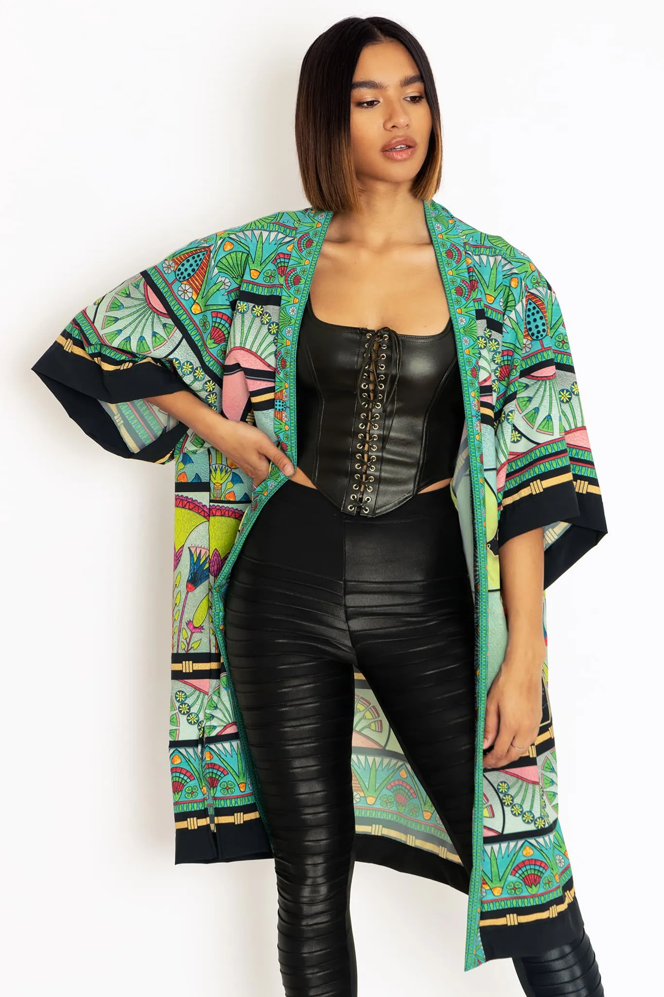 A distinctive print that draws inspiration from kitsch Hawaiian art, thoughtfully designed for versatile application across a wide range of swimwear styles and complementary accessories.